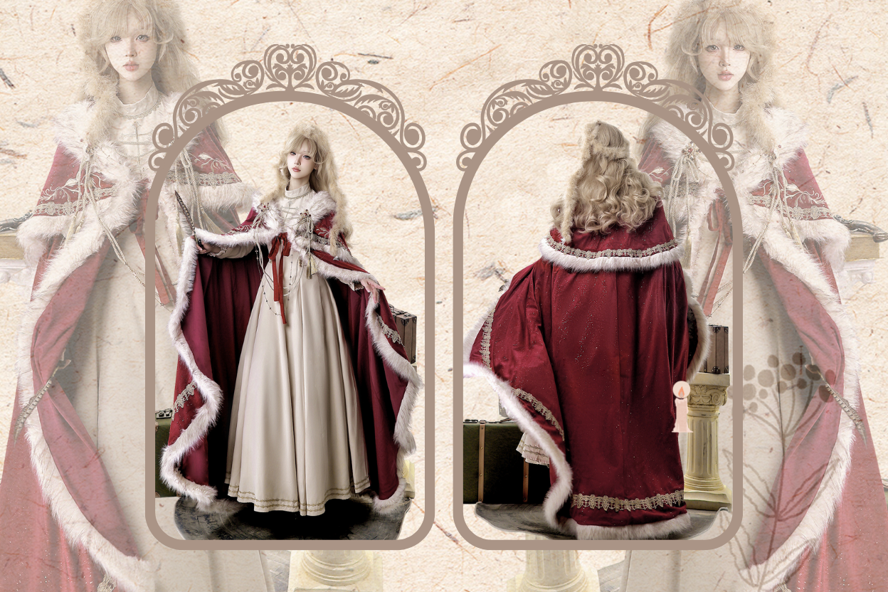 Beige Juliette Sleeve Nun Lolita Dress + Shimmer Red Embroidered Royal Cloak + Matching Rope Accessory